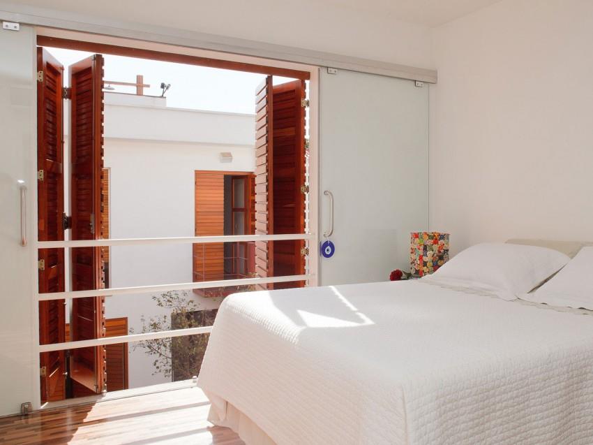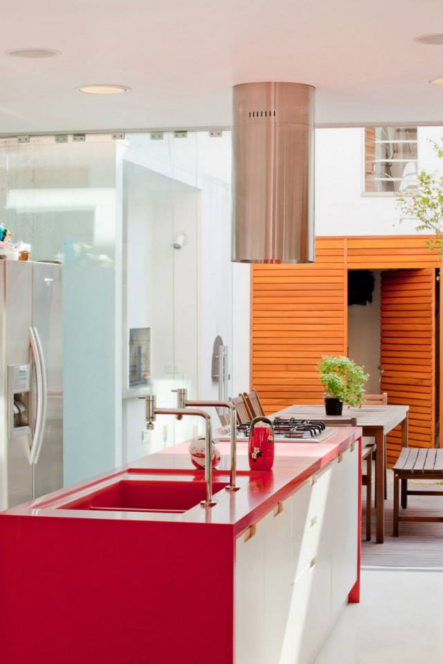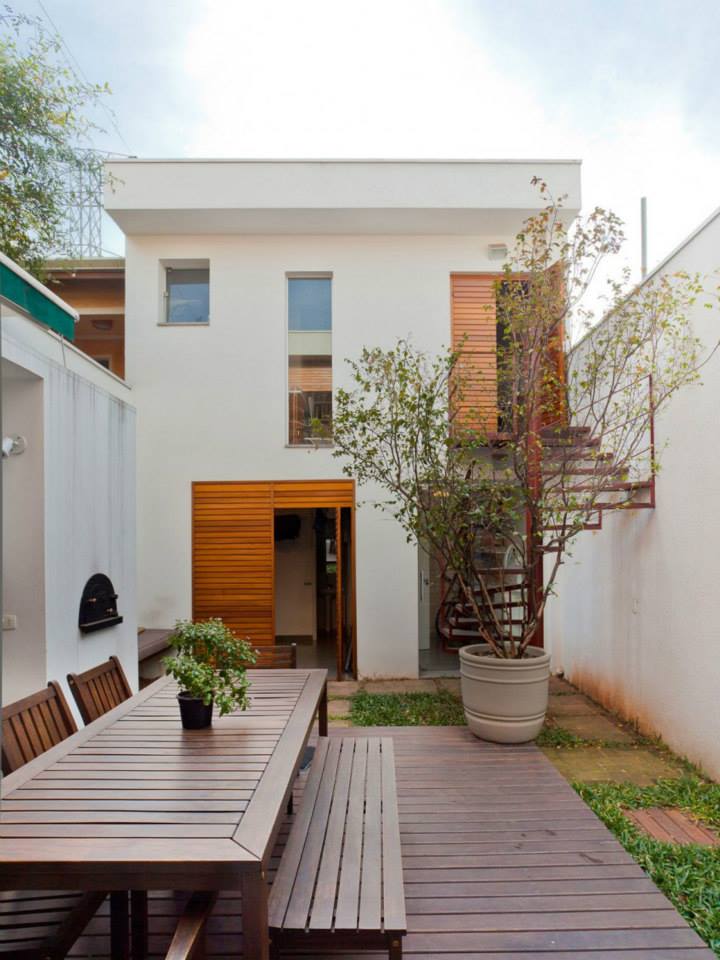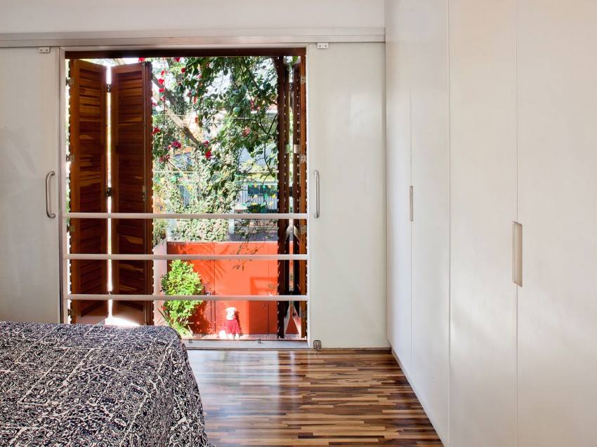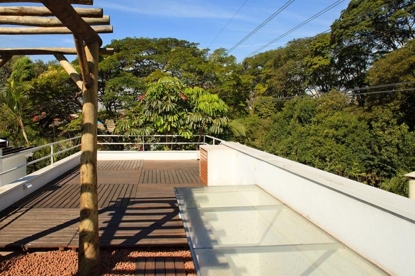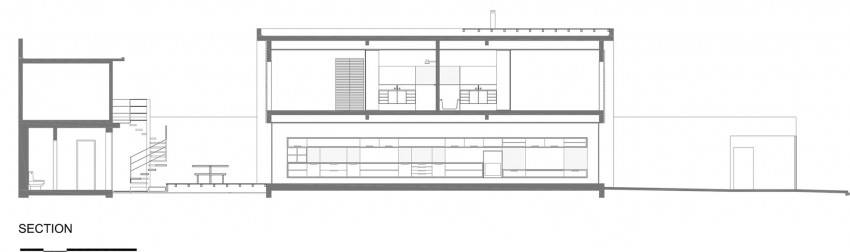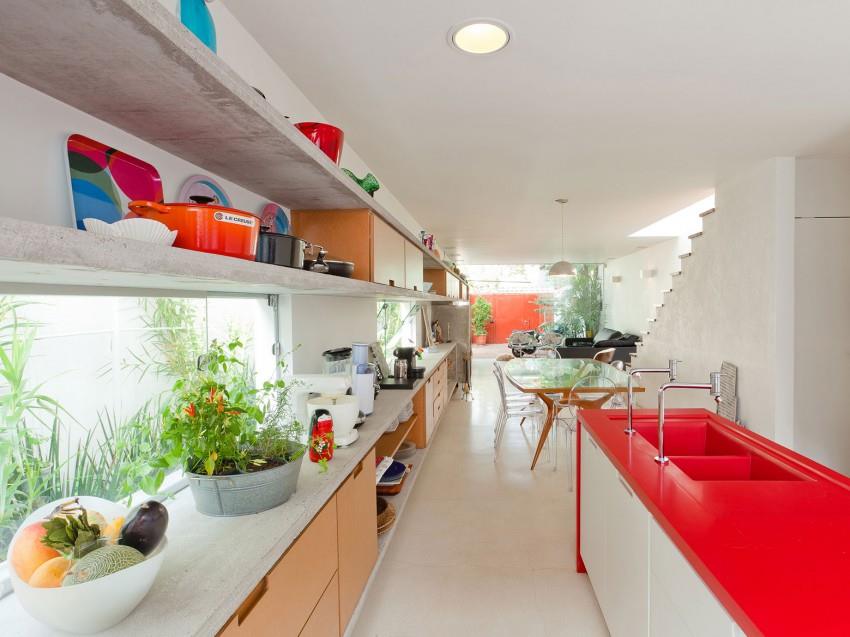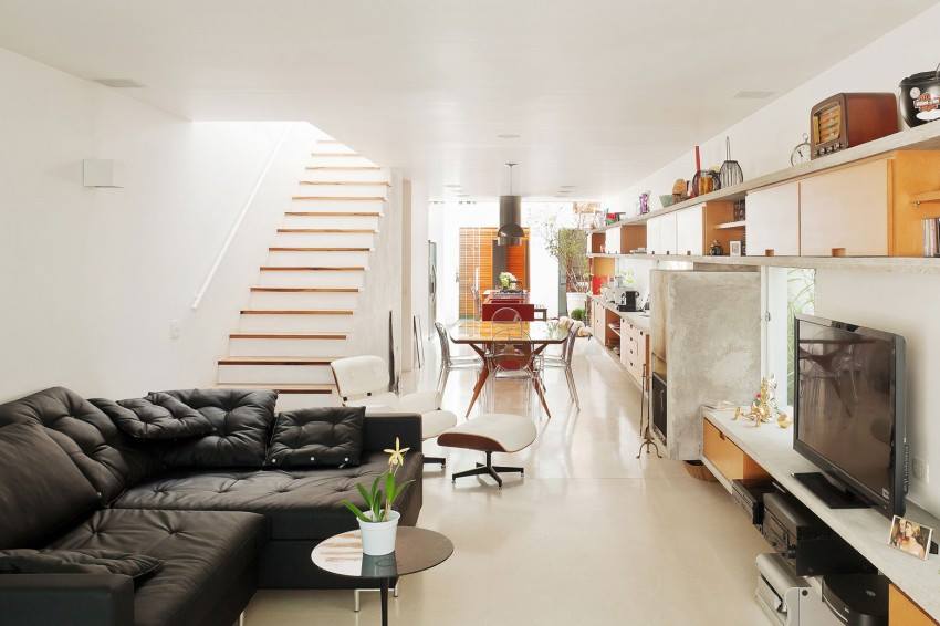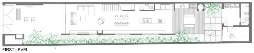 Căn nhà được xây dựng vào năm 2008 trên 1 khu đất có kích thước tương đối nhỏ hẹp. Nhận thức được những hạn chế về hình dạng khu đất, những nhà thiết kế đã để mở hầu như toàn bộ tầng 1, tạo dòng chảy linh hoạt về không gian. Các trang thiết bị nội thất được bố trí dọc theo chiều sâu của căn nhà để cung cấp hệ tủ kệ trong phòng khách cũng như đáp ứng khả năng lưu trữ cho khu vực bếp và phòng ăn. Cầu thang lên khu vực phòng ngủ được đặt đối diện với mảng bê tông và tắm trong ánh sáng mặt trời thông qua một mái nhà kính, kết nối với sân thượng- cũng là nơi bạn có thể chiêm ngưỡng toàn bộ không gian xanh xung quanh căn nhà. Giản dị nhưng thân thiện và ấm cúng chính là những cảm nhận đầu tiên khi được đặt chân vào bên trong ngôi nhà.