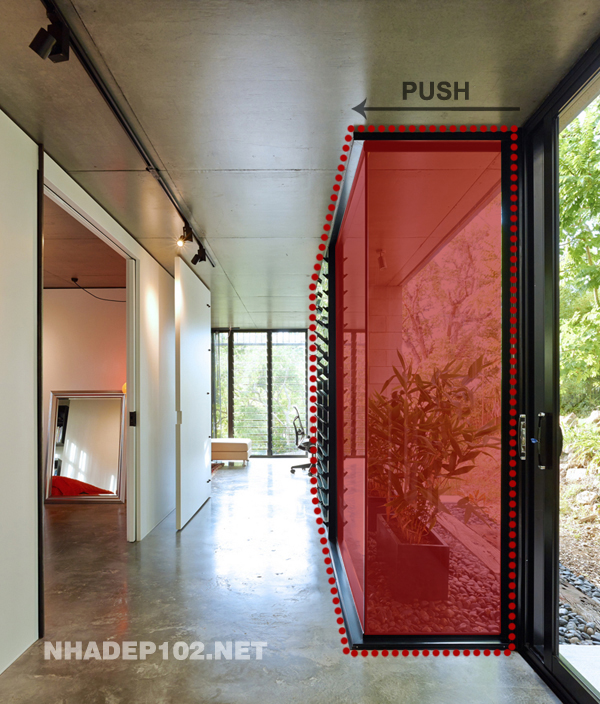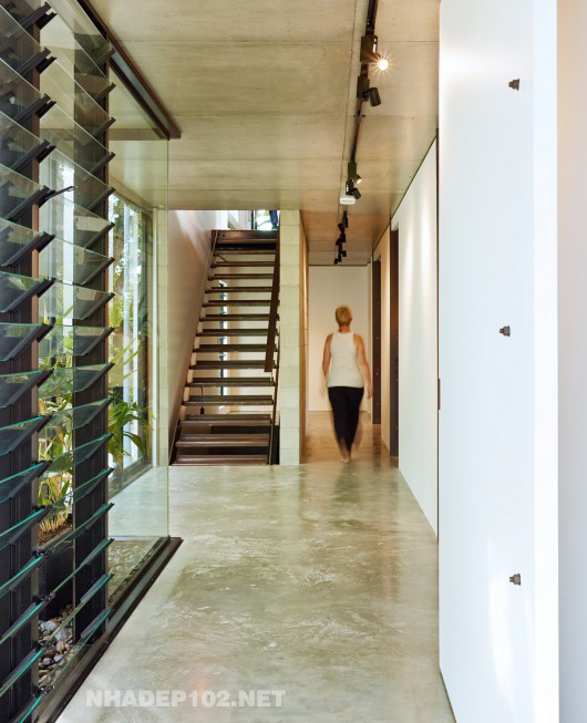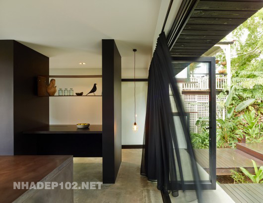 Sẽ không có gì đáng nói ở phần hông công trình nếu không có những khoảng lùi vô cùng giá trị, khiến những khoảng xanh trở thành một phần bên trong ngôi nhà. Rất nhiều ngôi nhà phố ý thức được việc chừa lại một phần diện tích cho cây xanh nhưng sẽ là vô nghĩa nếu không có giải pháp để kết nối chúng với không gian nội thất bên trong như ví dụ điển hình trên đây.