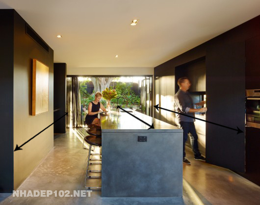 Một điểm tạo nên sự khác biệt nữa bên trong ngôi nhà này chính là cách thiết kế bếp. Thay vì xử lý bếp dạng chữ L, chữ U theo cách thông thường, không gian bếp ở đây lại được bố trí hoàn toàn theo chiều dọc, cách làm này không chỉ góp phần giải phóng diện tường phía sau mà còn tăng cảm giác về chiều sâu thực tế có được.