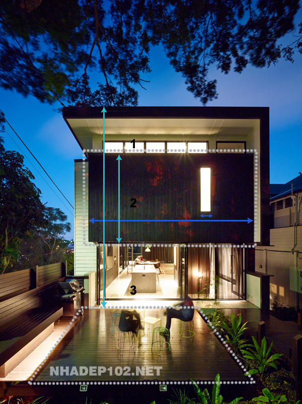 Xét về mặt tỷ lệ, các diện có kích thước tương đối hài hòa với nhau nhờ vào cách “ăn gian” phần diện tích đáng lẽ thuộc về ban công trên tầng 3. Bản thân diện gỗ choán phần lớn mặt tiền của ngôi nhà sẽ trở nên vô cùng nặng nề nếu thiếu đi các đường chỉ dọc (vốn có tác dụng nhấn mạnh kích thước theo phương dọc). Cách nhắc lại vật liệu gỗ trong khu vực hiên trước cũng là 1 cách tạo sự liên kết hiệu quả giữa trong và ngoài nhà.